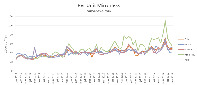 Mirrorless has a spike this year in the Americas most likely when the Sony A9 started shipping, however the main takeaway is that the Americas get the more expensive mirrorless and the rest of the world is pretty much the same as it has been for the past 1.5 years.
