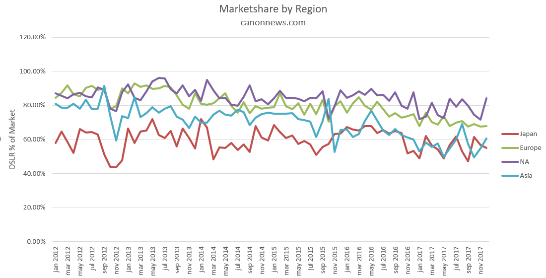 Asia, is still the primary market for mirrorless and the Americas is still the primary market for DSLR’s. Europe is facing a slower but consistent trend to more mirrorless over the last 2-3 years. For Europe and America regions, this translates to a much slower gain by mirrorless over time.