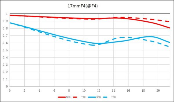 The MTF for the lens looks good; however, like most tilt-shift lenses, they aren't show the MTF once you get past the normal image circle of full frame to show how well the lens works when it's fully shifted. So we'll have to wait for independent tests to see how well it does in the corners shifted. However, since it's not falling off into the corners unshifted, we can guess that it's at a minimum decent unless it falls off a cliff in terms of resolution